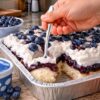 On low speed, slowly add the all-purpose flour and baking powder. Mix just until combined. Overmixing at this stage can result in dense bars, so we stop once the flour disappears into the batter.
